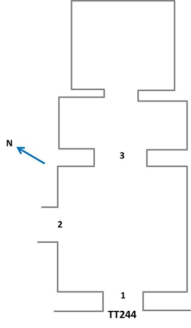 TT244 si sviluppa con più camere in sequenza; pochi i resti di scene parietali: il defunto in adorazione (1 in planimetria[9]); sull’architrave di un passaggio che adduce a “Kampp 268”[10] (2) il defunto e la moglie (di cui non è leggibile il nome), inginocchiati, adorano Anubi. In altro passaggio (3) il defunto e la moglie offrono mazzi di fiori a una divinità e la moglie che offre fiori a un’altra divinità. Una breccia nella seconda sala adduce verso la TT192[11].
