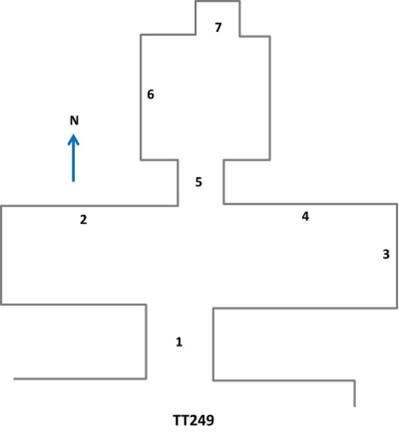 TT249 si sviluppa, planimetricamente, con forma a “T” rovesciata tipica delle sepolture del periodo; ad un corridoio di accesso, sulle cui pareti (1 in planimetria[7]) sono rappresentati, in una scena incompiuta, il defunto e la moglie, segue una sala trasversale con scene parietali danneggiate. Sulle pareti, su due registri sovrapposti (2), il defunto adora Osiride e Hathor; scene della processione funeraria con il trasporto del sarcofago e un uomo adorante nei pressi della tomba; sulla parete più corta, a est, (3) una stele (abrasa) con uomini ai lati in offertorio e alcune prefiche e portatori di offerte con il defunto e la moglie.