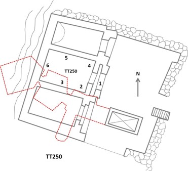 TT250 si trova al centro della necropoli di Deir el-Medina; comprende tre cappelle affiancate[14] costruite in mattoni cotti, cui si accede da un cortile[15] ma solo la cappella centrale, una semplice sala rettangolare, è decorata. La decorazione è ritenuta di particolare valore giacché si tratta dell’unica cappella le cui pareti sono state realizzate in stile monocromo[16] [17] di cui si abbia notizia.