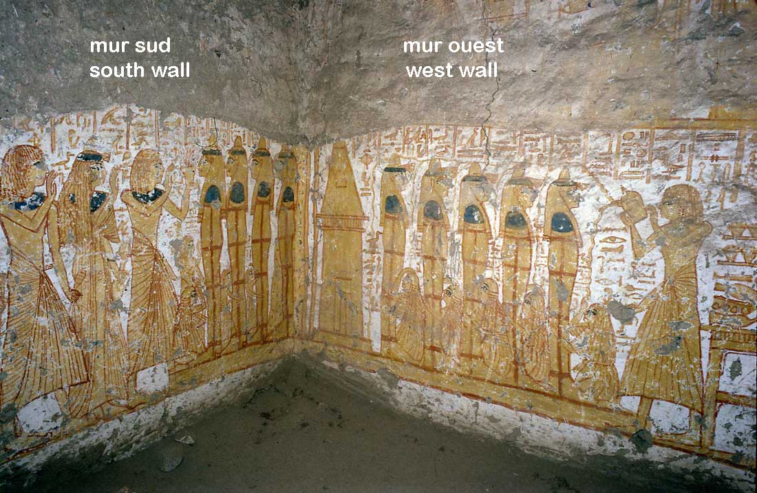 Su altre pareti, su tre registri sovrapposti (4-5), frammenti di persone dinanzi a Neferhotep (TT216), alla moglie Iyemuau e al figlio Nebnefer (TT6); persone dinanzi ad Hathor rappresentata come vacca sacra e, in due scene, un uomo con giara contenente grano dinanzi a persone sedute dinanzi a sei donne pure assise. Sulla parete di fondo (6) una stele su tre registri: il defunto adora Osiride mentre la moglie adora Amenhotep I; in una doppia scena, uomini adorano Anubi e la regina Ahmose Nefertari. Scene di libagioni e preti con gli strumenti del Cerimoniale di apertura della bocca seguiti da un Prete lettore[20] e da cinque donne che precedono altrettante mummie femminili, accompagnate alla loro tomba dalle sorelle dolenti[21].