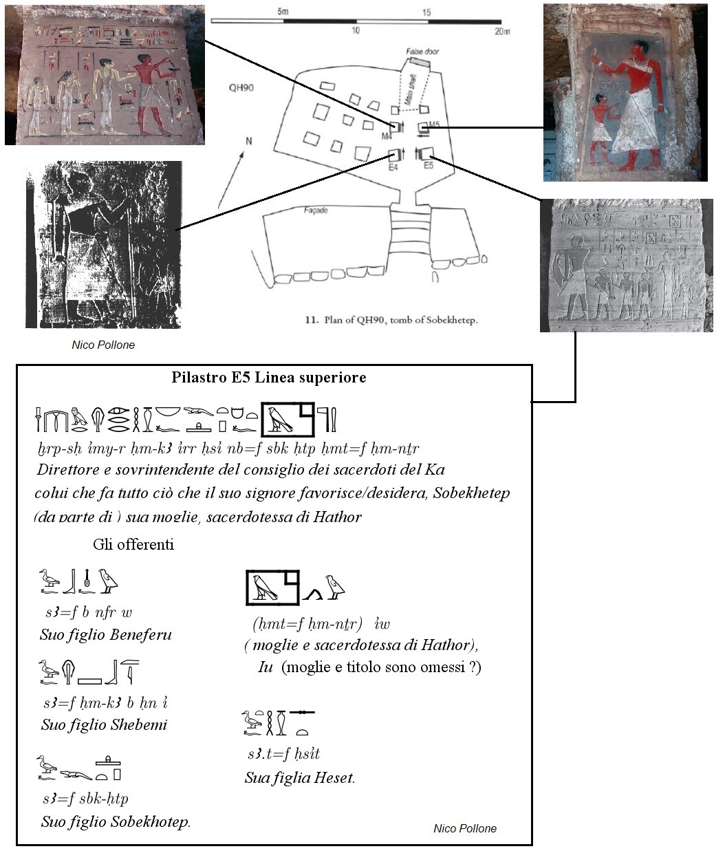In diagonale rispetto all’asse del pilastro M4, il pannello che raffigura l'”ispettore dei sacerdoti ka” di rango inferiore, Mekwt, con la sua famiglia. Il testo relativamente lungo scritto sulla parte superiore del pannello si riferisce all’offerta dei sacerdoti ka sotto forma di cibo tramite uno dei tanti testi di questo tipo che si trovano in tutto il cimitero e che forniscono indicazioni sul ruolo dei culti ka nell’economia locale.