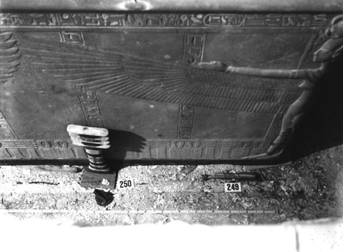 All’interno della camera sepolcrale di Tutankhamon non c’era soltanto l’amuleto “djed” del mattone magico celato nella parete sud ma anche un secondo amuleto (Carter 250), più grande, lasciato dai sacerdoti che officiavano i riti funebri tra il sarcofago in quarzite di Tutankhamon ed il quarto sacrario, quello più interno.