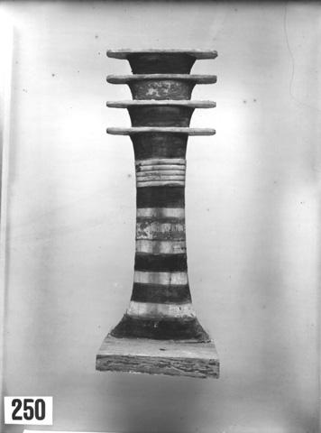 Alto 56 cm e largo 20, in legno dipinto, aveva ancora sulla base un perno che suggerisce potesse essere inserito su un supporto.