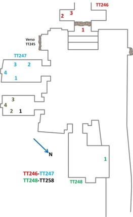 [6] Le quattro tombe costituivano l’unica casa di Hasan Ahmed el-Gurni (TT245, TT246, TT247, TT248). Fino a tempi molto recenti, infatti, alcune delle tombe vennero adibite ad abitazioni o a pertinenze di abitazioni, come stalle, cantine, depositi e magazzini. Tale impiego, protrattosi per millenni, com’è intuibile, ha ulteriormente favorito il danneggiamento di già precarie rappresentazioni parietali o, in taluni casi, ha addirittura causato la perdita o la demolizione di pareti o colonne, o pilastri. I riferimenti di Gardiner e Weigall ad abitazioni private debbono perciò essere intese in tal senso e fanno riferimento, come è ovvio, agli anni in cui le rilevazioni ebbero luogo considerando che la pubblicazione del “Topographical Catalogue” risale al 1913.