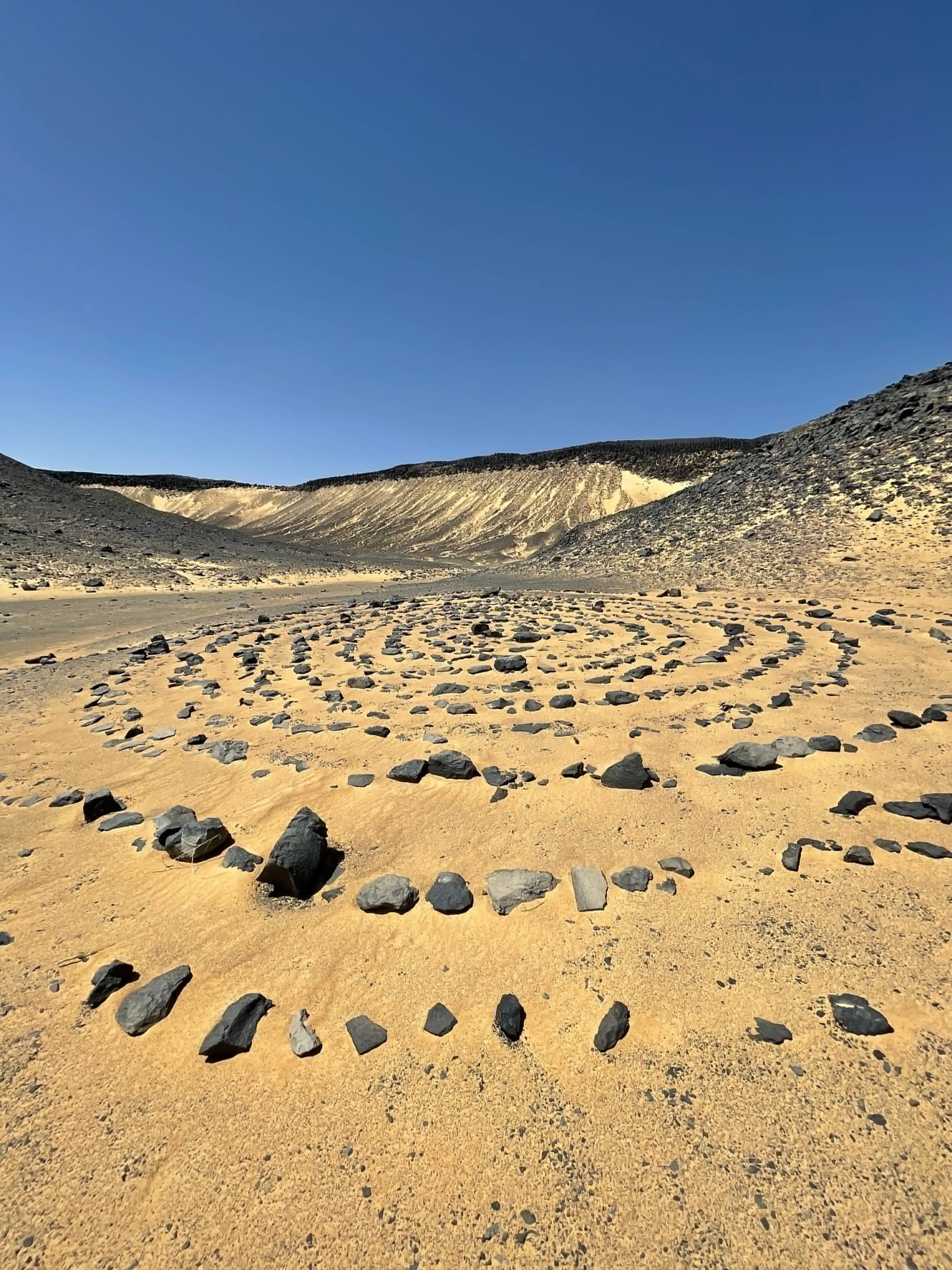Parcheggiata l’auto, ci avventuriamo a piedi ad esplorare la zona, ognuno per conto proprio; in uno spiazzo pianeggiante ai piedi della collina più maestosa notiamo una particolare struttura di pietre collocate in cerchi concentrici che si trova anche nel deserto algerino e che è nota con il nome di “tomba preislamica”.
