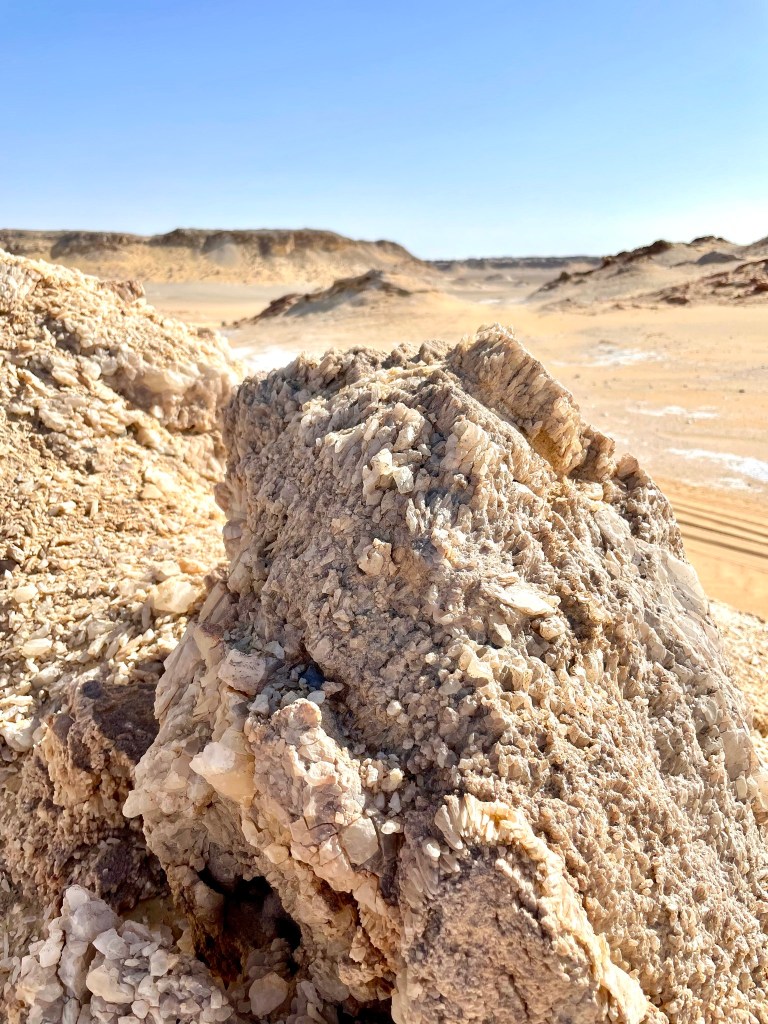 Abbandonato il Deserto nero ci dirigiamo verso sud e ci fermiamo nei pressi di una collina chiamata Montagna di Cristallo, costituita da agglomerati di grandi cristalli di barite e di calcite (non di quarzo come si legge quasi ovunque) sui quali si riflettono i raggi del sole. Essi sono il risultato di un processo di cristallizzazione unico, che ha avuto luogo milioni di anni fa, a quanto pare quando un grande meteorite colpì la Terra causando temperature molto elevate.