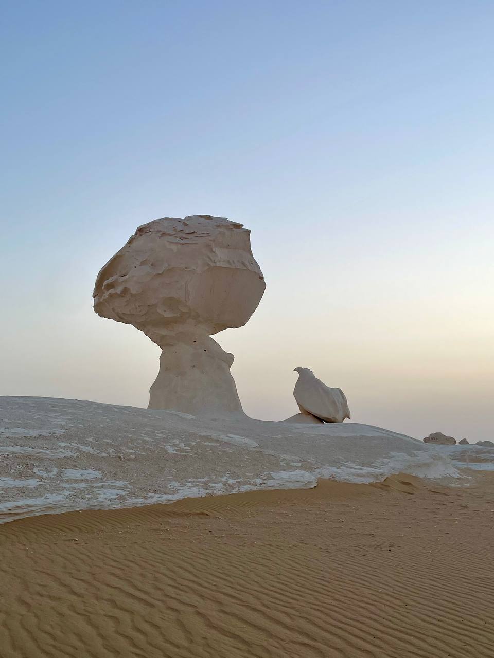 Al mattino, il sole si leva presto ed implacabile e la guida ci prepara una colazione degna di un grand’hotel, quindi smonta il campo e ci accompagna a vedere le formazioni rocciose note per la loro forma curiosa: la Sfinge, il Coniglio, Nefertiti, il Pollo ed il Fungo.