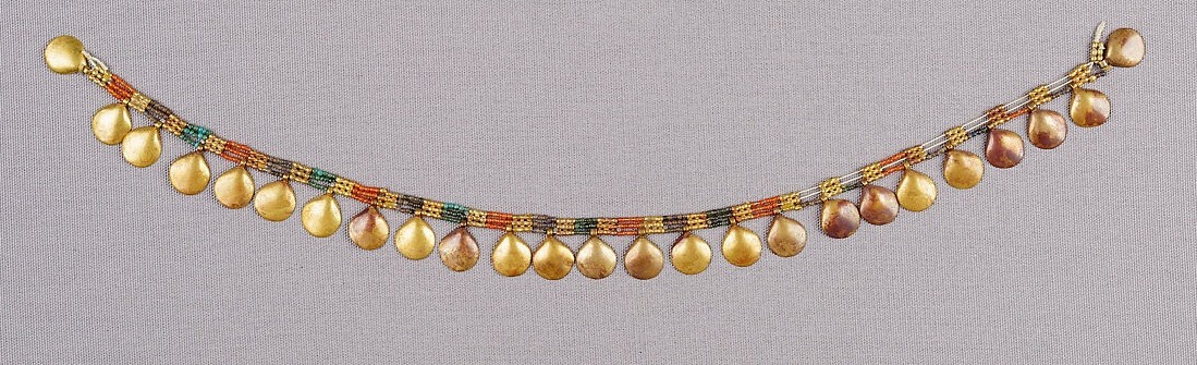Questa delicata collana è un frammento di un più lunga, costituita da tre file di perline in oro, maiolica, corniola e turchese alla quale sono sospese 25 conchiglie in oro.