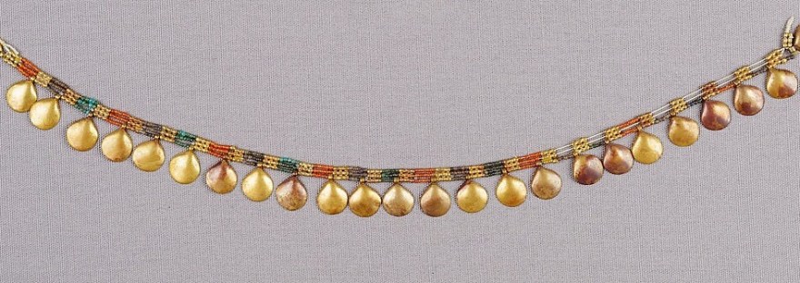 La collana di Senebtisi, decorata con conchiglie in oro, ed altri gioielli del suo corredo funerario.