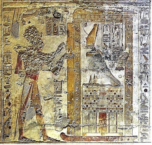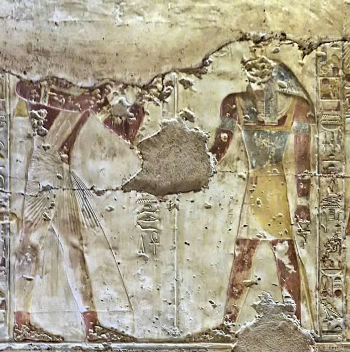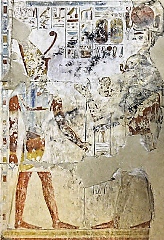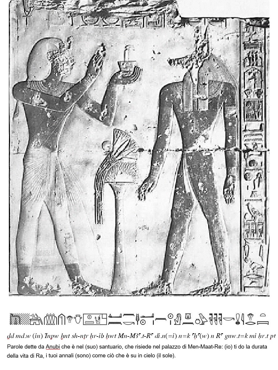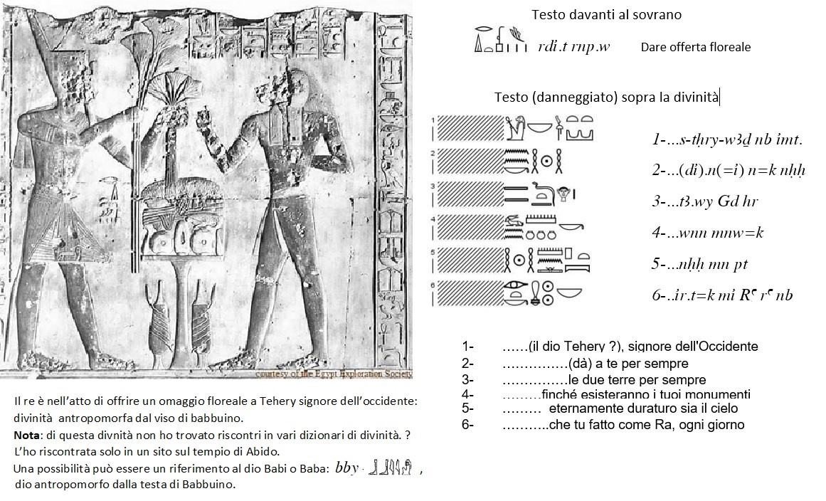 Il re è nell’atto di offrire un omaggio floreale a Tehery signore dell’occidente: divinità antropomorfa dal viso di babbuino.