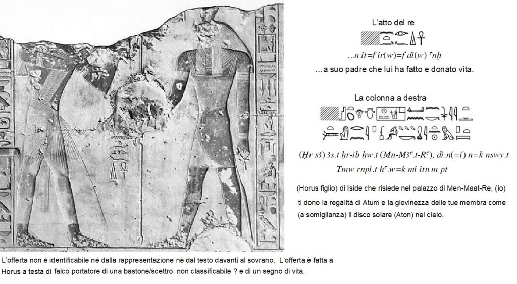 L’offerta non è identificabile né dalla rappresentazione nè dal testo davanti al sovrano. L’offerta è fatta a Horus a testa di falco portatore di una bastone/scettro non classificabile ? e di un segno di vita.
