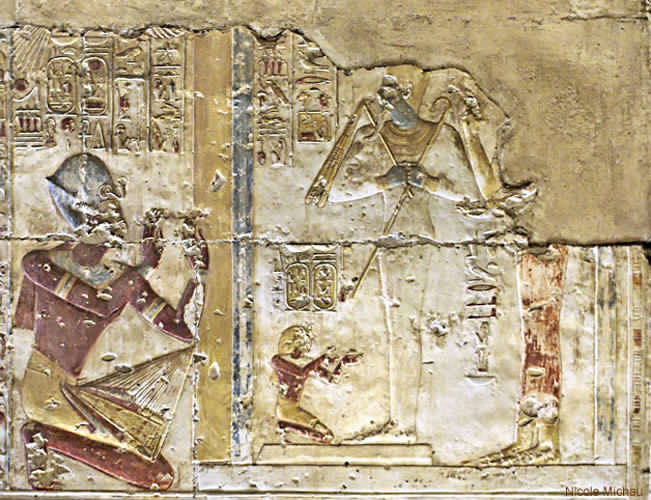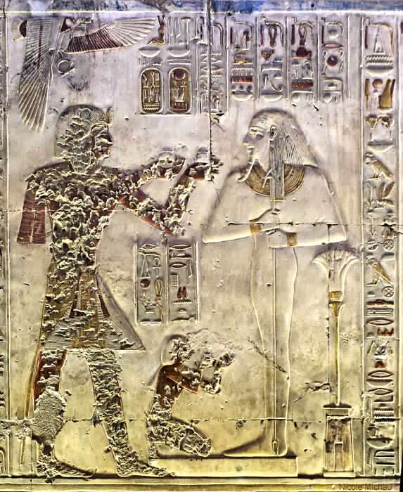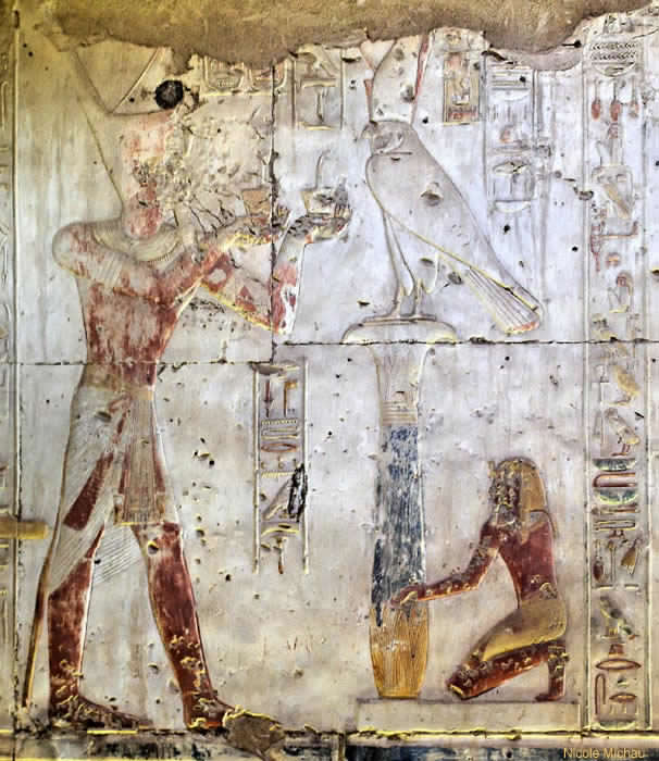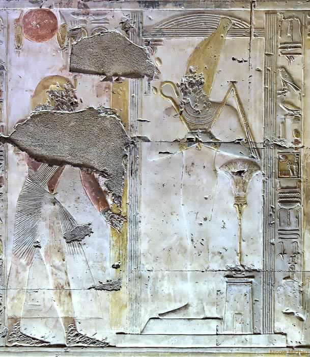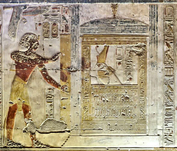 Offerta di vasi da vino (irp) chiamati nu a Irrenefdjesef, : iri-rn.f-Ds.f. ICONOGRAFIA: Si manifesta di regola come un falco o un uomo con la testa di falco (non in questo caso) Il suo nome significa “Colui che crea il proprio nome”, un epiteto che può essere interpretato come “Colui che ha creato se stesso”, conferendogli un carattere di creatore (demiurgo). Si trova nel pantheon egizio fin dal Nuovo Regno. Si trova nelle formule XVII e XCIX del Libro dei Morti, un testo che si riferisce a ciò che il defunto doveva recitare per ricondurre la barca a sé. Raramente rappresentato. Qui, nel tempio di Sethy ad Abydos, è in forma umana. Un’altra dea è citata nel testo innanzi alla fronte del sovrano, si tratta di Wadjet.