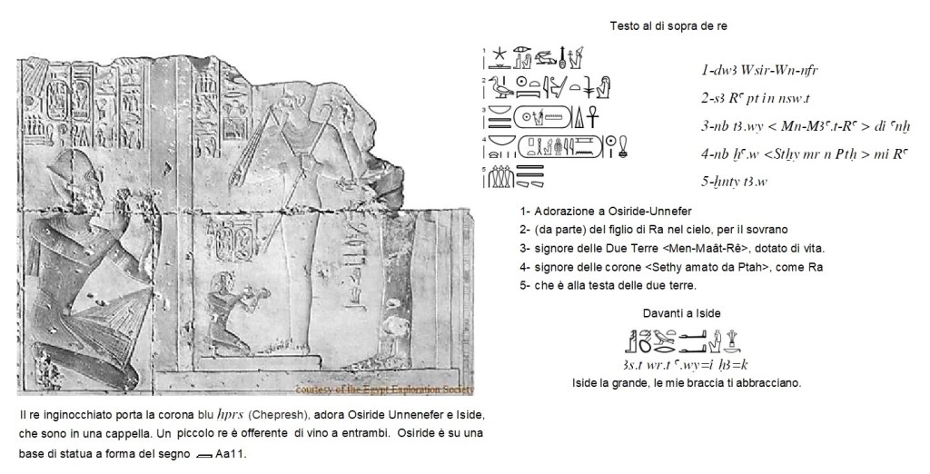 Il re inginocchiato porta la corona blu xprs (Chepresh), adora Osiride Unnenefer e Iside, che sono in una cappella. Un piccolo re è offerente di vino a entrambi. Osiride è su una base di statua a forma del segno Aa11.