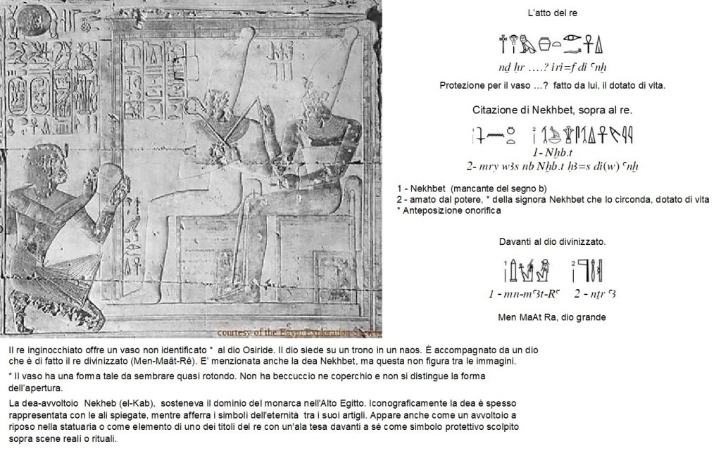 Il re inginocchiato offre un vaso non identificato * al dio Osiride. Il dio siede su un trono in un naos. È accompagnato da un dio che è di fatto il re divinizzato (Men-Maât-Rê). E’ menzionata anche la dea Nekhbet, ma questa non figura tra le immagini.
