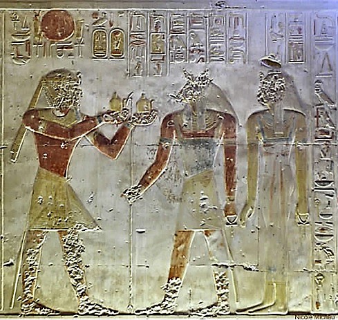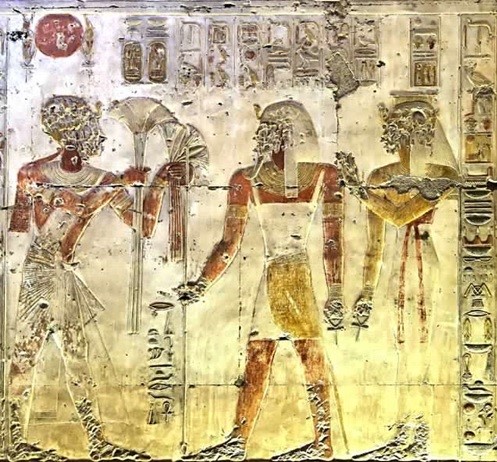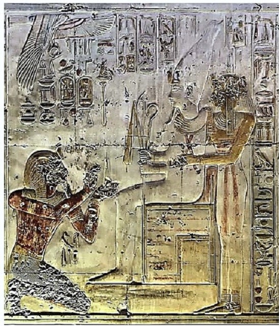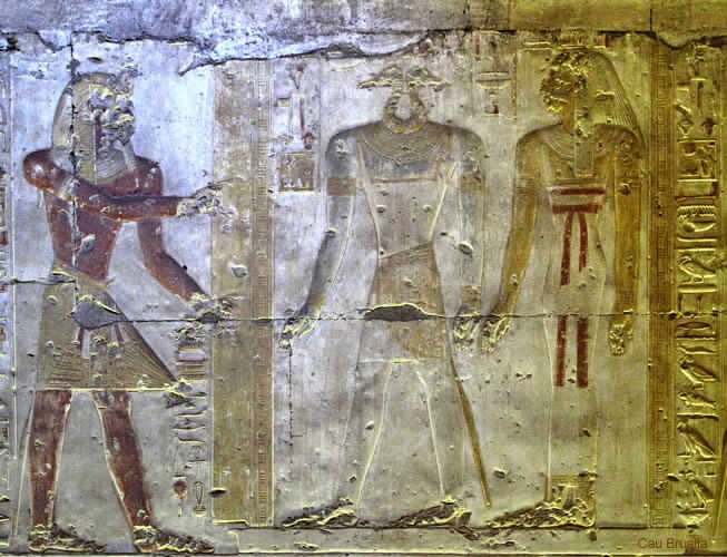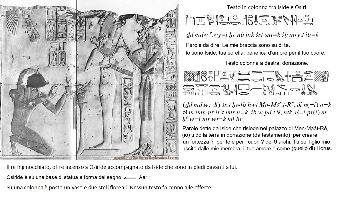 Il re inginocchiato, offre incenso a Osiride accompagnato da Iside che sono in piedi davanti a lui.