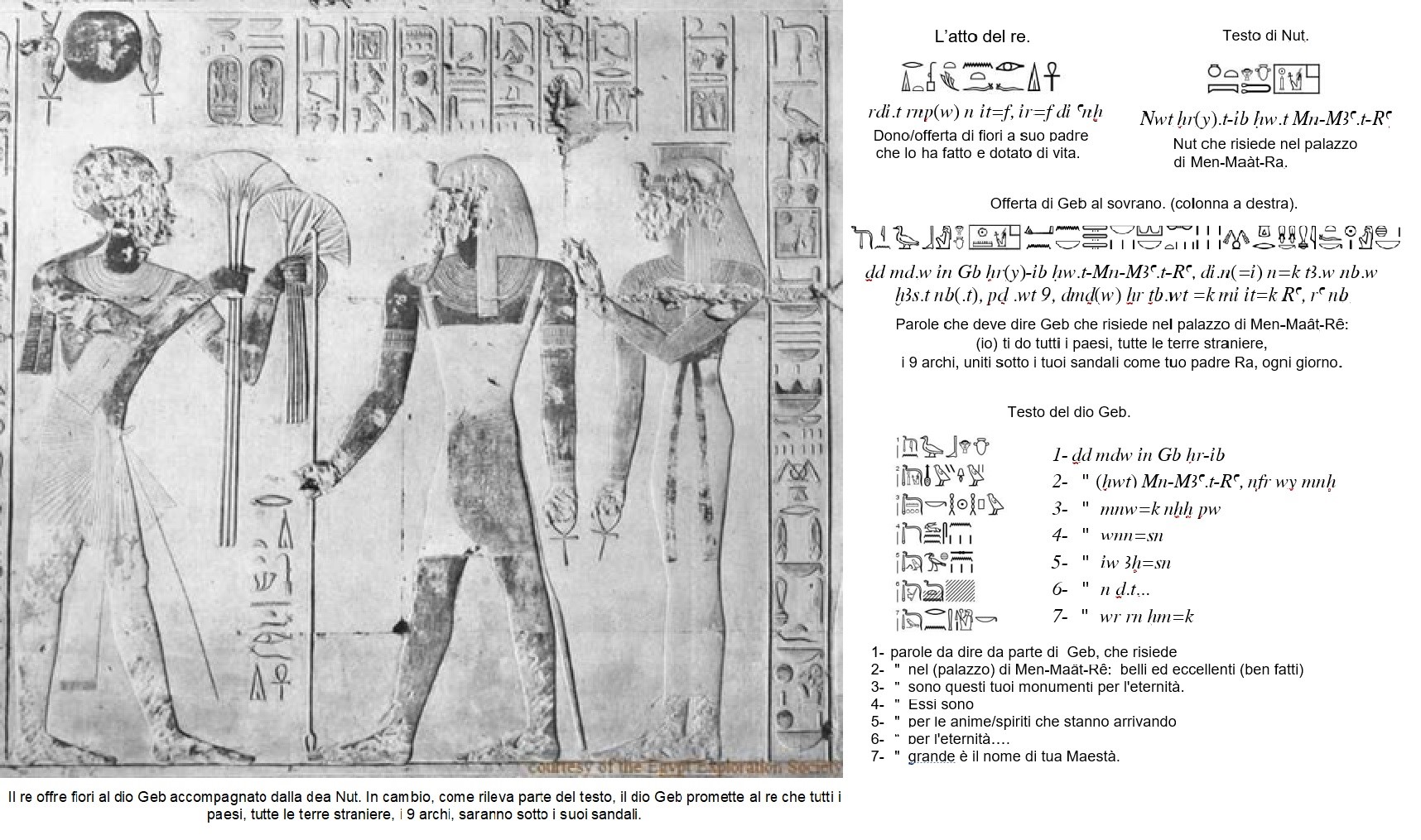 Il re offre fiori al dio Geb accompagnato dalla dea Nut. In cambio, come rileva parte del testo, il dio Geb promette al re che tutti i paesi, tutte le terre straniere, i 9 archi, saranno sotto i suoi sandali.