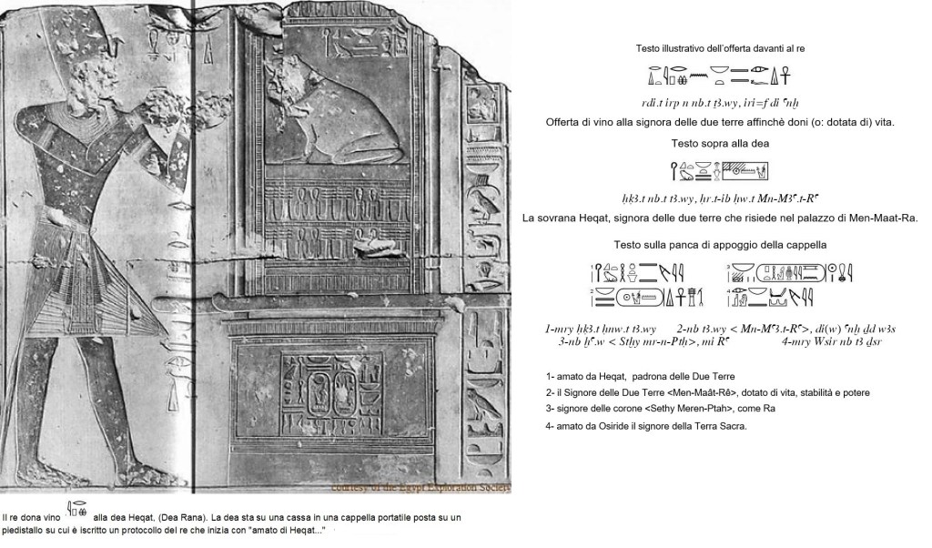 Il re dona vino alla dea Heqat, (Dea Rana). La dea sta su una cassa in una cappella portatile posta su un piedistallo su cui è iscritto un protocollo del re che inizia con “amato di Heqat…”