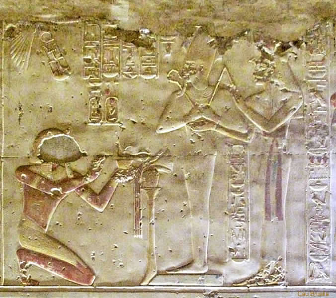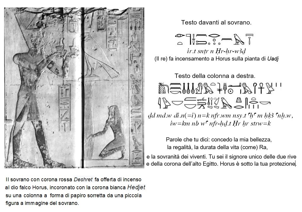 Il sovrano con corona rossa Deshret fa offerta di incenso al dio falco Horus, incoronato con la corona bianca Hedjet, su una colonna a forma di papiro sorretta da una piccola figura a immagine del sovrano.
