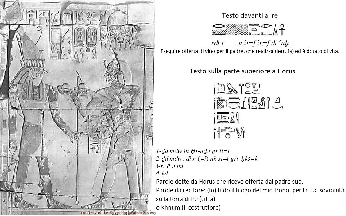 Il re offre a Horus offerta di vino in classici recipienti tondeggianti nw. Horus porta la doppia corona circondata alla base da urei. Regge nelle mani un segno della vita e uno scettro Was.