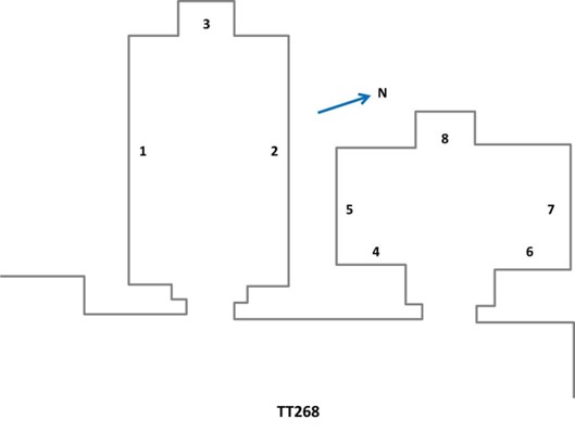 TT268 è costituita da due sale adiacenti tra loro che sono forse assegnabili al medesimo titolare; è verosimilmente identificabile la sala di sinistra come cappella e la destra come sala sussidiaria non assegnabile con certezza, tuttavia, ad alcuno: sulle pareti (1 in planimetria[8]) due navi in navigazione, un uomo e una donna dinanzi ad un’altra coppia; personaggi che raccolgono l’uva; sulla parete opposta (2) il defunto e la moglie assisi con una fanciulla che offre a loro libagioni in presenza di un’arpista, una danzatrice e alcuni ospiti. SUl fondo, in una nicchia (3) una stele con il defunto, la moglie e un piccolo fanciulli, nonché alcuni preti officianti.