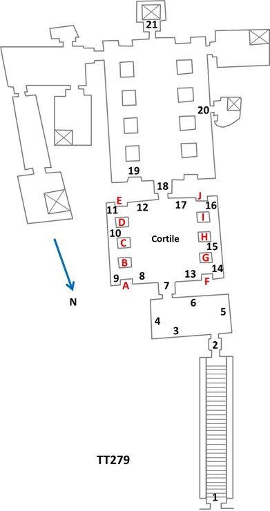 Scavata negli anni 1918-1919 da Ambrose Lansing per conto del Metropolitan Museum di New York, dal 2004 è parte della concessione archeologica italiana a Luxor[7]; TT279 costituisce una delle sepolture più grandi dell’area delle Tombe dei Nobili; si sviluppa planimetricamente partendo da una lunga scala che immette in un vestibolo; da questo si accede ad una corte colonnata e, attraverso un altro corridoio, ad una sala ipostila con pilastri da cui si dipartono cappelle laterali e pozzi funerari. Sugli stipiti che precedono la rampa (1 in planimetria[8]), testi dedicatori; una piccola anticamera (2) reca sulle pareti una barca sacra con una divinità maschile tra le dee dell’Oriente e dell’Occidente e immette in una sala rettangolare. Sulle pareti: (3-4) un lungo testo dedicatorio del figlio Tahorpakhepesh e scene della processione funeraria con dolenti su barche e del pellegrinaggio ad Abydos.