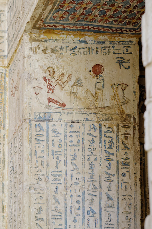 sulle architravi che congiungono i pilastri tra loro, testi dedicatori. Sulle pareti della corte (8) inni e Litanie di Ra, il defunto che adora Ra-Horakhti e offre libagioni e incensi; poco oltre (9) testi dedicatori recitati dal defunto. Sulla parete più lunga (10) liste di offerte con il defunto assiso e un cane, di cui viene indicato il nome, Heknu, accucciato sotto la sedia; in una scena alcuni preti recitano liste di offerte. Segue (11) il defunto in adorazione di Ptah e (12), su due regiwtri, Psammetico I con latte e la regina Nitocris I con sistri, seguiti dal defunto, dinanzi a Ra-Horakhti e Hathor. Su altre pareti (13) lunghi testi e il defunto in adorazione di Atum e in offertorio ai suoi genitori; poco oltre (14) un testo e un uomo inginocchiato che adora due divinità poste più in alto. Sulla parete lunga (15) preti con liste di offerte dinanzi al defunto assiso, con il cane Heknu sotto la sedie, e un figlio, in qualità di prete, in offertorio; seguono (16) testi con il defunto che detta a uno scriba e (17), su due registri, la regina Nitocris I con vino, seguita dal defunto, che offre libagioni a Osiride, Iside e Harsiesi[7].