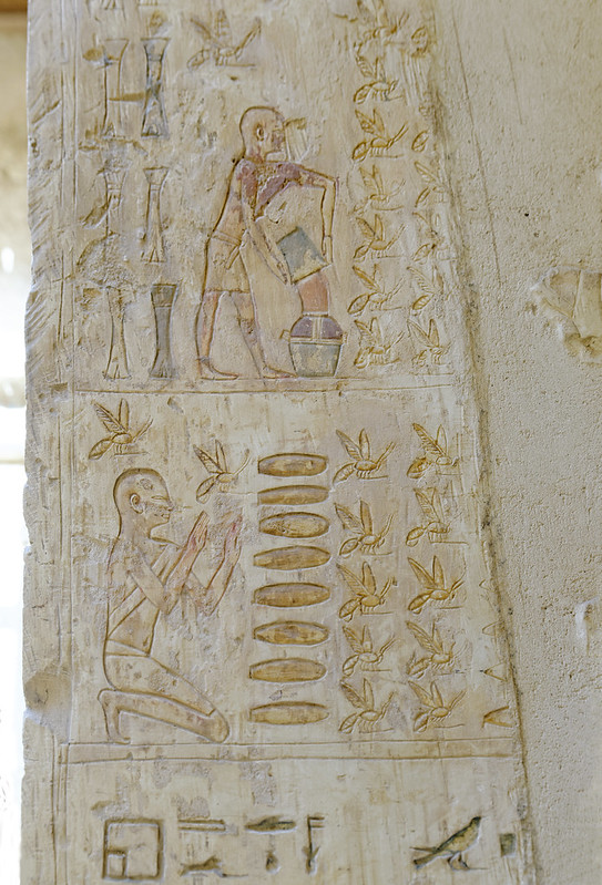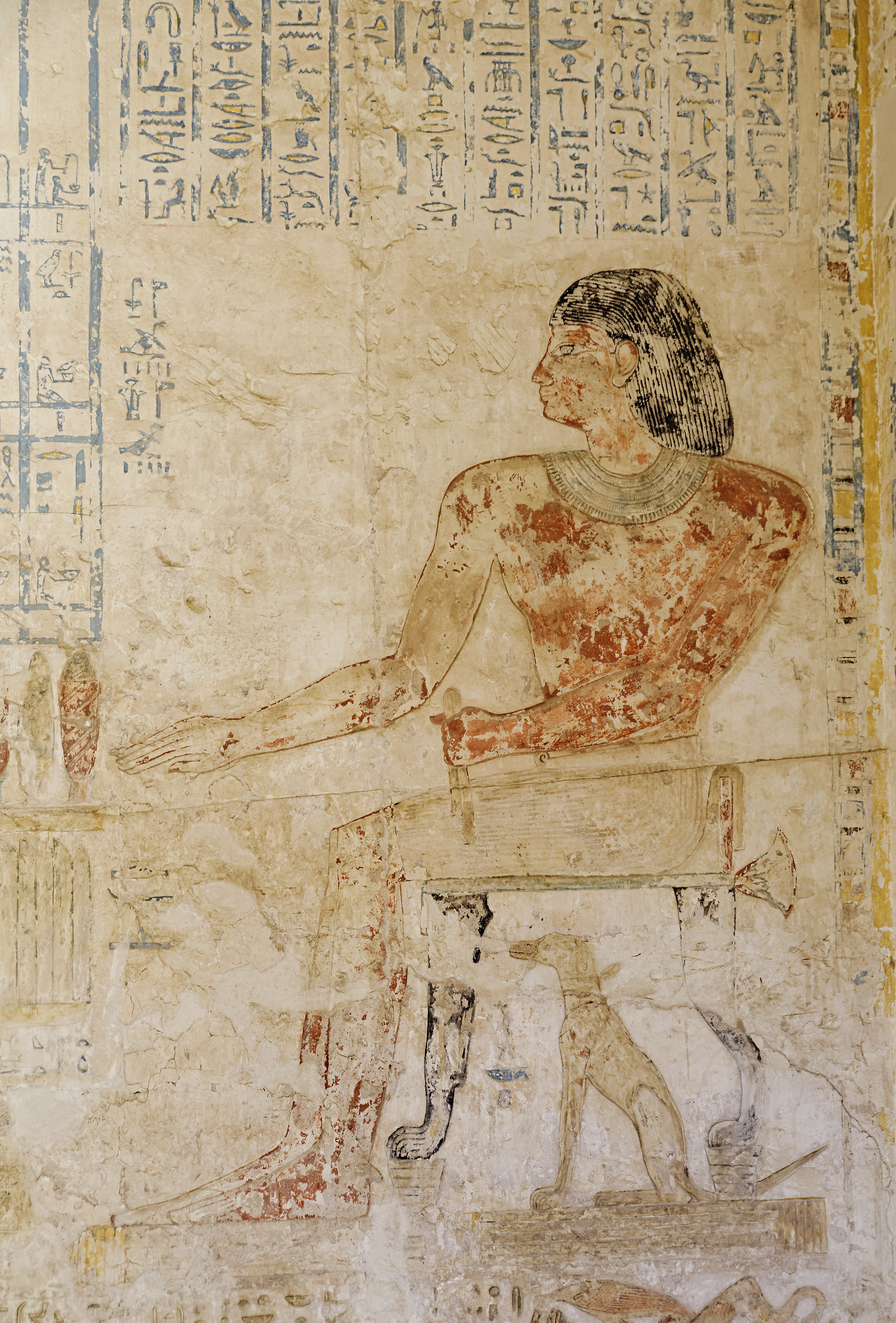 - C: su quattro registri, il defunto in posizione alta sovrintende alle scene inferiori: scene di filatura e di pulitura del pescato, portatori di offerte, il defunto con i suoi assistenti, pastori e cacciatori armati di bastoni da lancio, piccoli fanciulli (forse figli del defunto);
