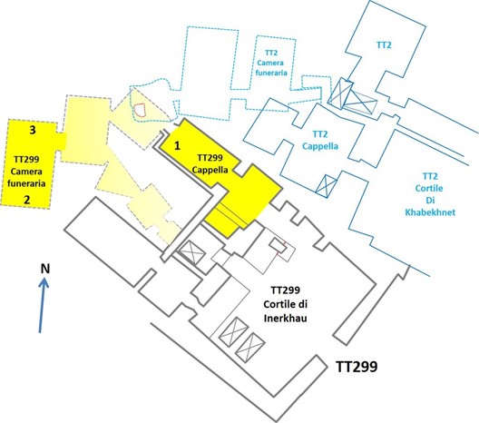 La TT359, molto malridotta, è tuttavia l’unica ancora accessibile e si ritiene fosse destinata ad accogliere i familiari mentre la TT299 era destinata allo stesso Inerkhau.