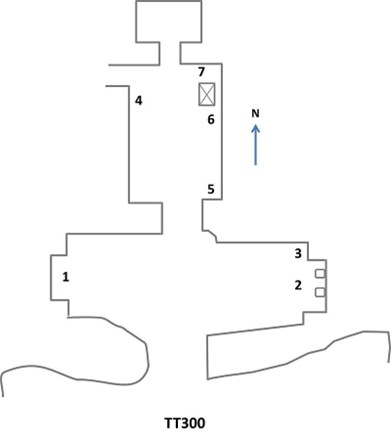 TT300 si presenta con struttura planimetrica a “T” rovesciata, tipica delle sepolture del periodo. A un corridoio segue una sala trasversale; sulle pareti in una nicchia (1 in planimetria[7]) il defunto e la moglie, in due registri sovrapposti, il defunto in atto di adorazione.