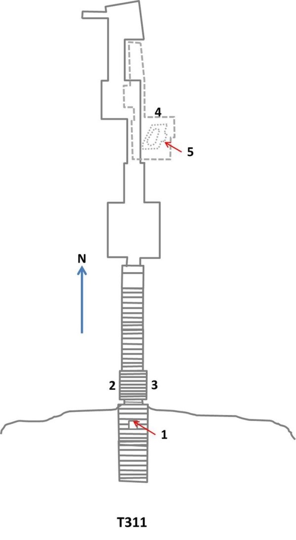 Il corridoio prosegue con il medesimo orientamento fino all’accesso a un appartamento sotterraneo in cui (5) si trova il sarcofago; sulla parete (4) brani dai Testi dei sarcofagi. Nella tomba vennero rinvenute: