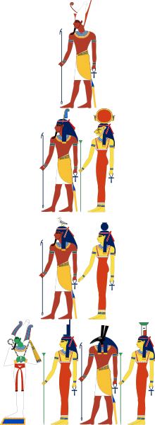 Immagine n. 1 Rappresentazione schematica dell’ Enneade Eliopolitana. Dall’alto in basso e da sinistra a destra sono raffigurate le divinità che la compongono: Atum, Shu e Tefnut, Geb e Nut, Osiride, Iside, Seth e Nefti. (da Wikipedia, licenza Creative Commons CC0 1.0 Universal Public Domain Dedication).