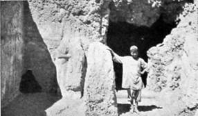 | Il cortile di TT335 in una foto di Bruyére | Il pozzo discendente all’appartamento funerario |