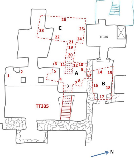 TT336 prevedeva due cappelle, indicate come “del nord” e “del sud”, il cui accesso si apriva in un cortile. La cappella del nord è costituita da un’unica sala rettangolare; la cappella del sud è costituita da una sala perpendicolare all’ingresso, da cui si accede a una sala trasversale nell’angolo nord della quale si apre il pozzo di discesa all’appartamento funerario costituito da due locali (“A” e “B” azzurri in planimetria[8]).