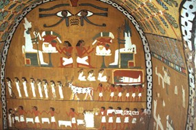 I dipinti parietali, aldilà delle mutilazioni cui si è sopra accennato e del fatto che in alcuni tratti appaiono incompleti, sono di buona fattura e applicati su una base generalmente gialla. Sulla parete sud (1 in planimetria[14]) due occhi di Horus sovrastano Osiride e Anubi[15] che si fronteggiano seduti; dinanzi alle divinità, ancora con perfetta simmetria, la figura del defunto inginocchiato dinanzi a due tavole per offerte.
