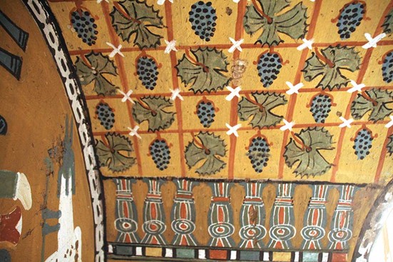 [19] Unica altra rappresentazione nota di pergola con uva si trova nella TT96 denominata, appunto, anche “Tomba delle Vigne”. La TT96, peraltro, è intestata a tale Sennefer, Sindaco di Tebe, ma non è dato di sapere se si tratti del figlio di Amenemhat, titolare della TT340.