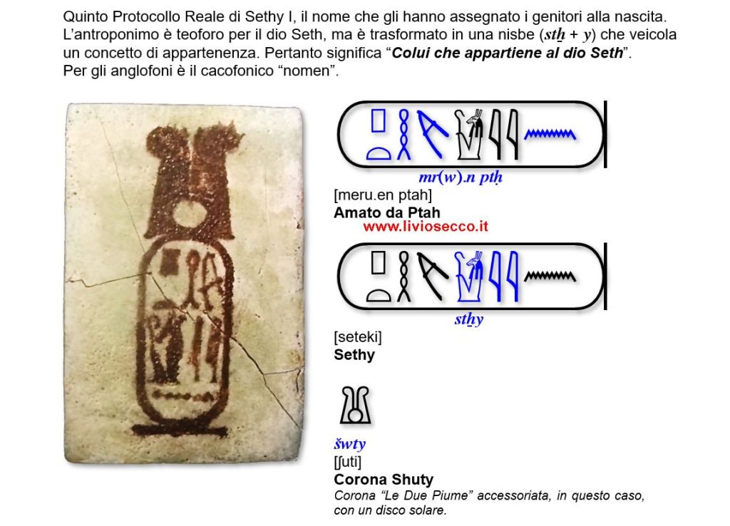 Una curiosità sul Quinto. Come dettagliato nell’immagine a corredo il significato dell’antroponimo Sethy è “Colui che appartiene a Seth”. Come nome proprio di un sovrano egizio, per qualcuno, sarebbe abbastanza discutibile. Nell’errato immaginario collettivo il dio Seth corrisponde al diavolo creando una situazione imbarazzante. E’ come se il papa si chiamasse Lucifero I (che, tra l’altro, è un bellissimo nome significando “Portatore di Luce”). In realtà il significato di Sethy (Colui che appartiene a Seth) vuol dire che il sovrano egizio è in grado di gestire il dio del caos, il disordine mondiale. Pertanto, fino a quando il re terrà a bada il caos l’Egitto non avrà nulla da temere.