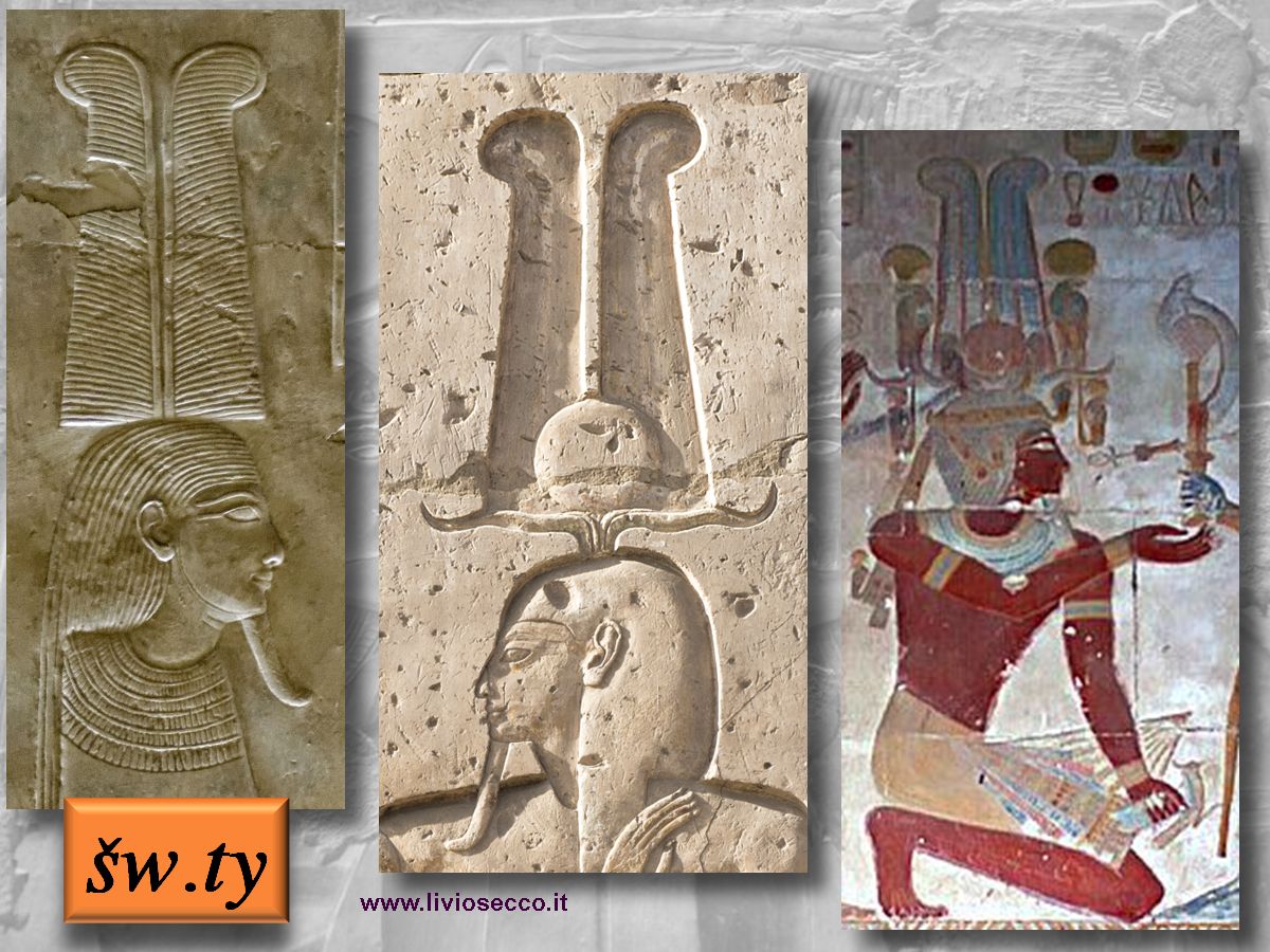 La corona SHUTY è formata da due piume che sono state in seguito decorate con altre aggiunte. Qui la vediamo nella forma base originale, poi con l’aggiunta di un disco solare alla base con le corna di ariete e quindi con l’aggiunta di due urei sopra e due sotto le corna di ariete e tutti quattro con un disco solare.