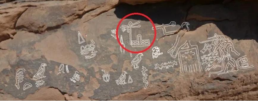 Il graffito infatti mostra una processione di barche cerimoniali sulla destra delle quali si trova il serekh di Djer sovrastato da un falco che colpisce con una mazza un nemico inginocchiato; in alto a sinistra rispetto al falco è stato inciso in geroglifico il nome di Neithhotep (evidenziato in rosso nell’immagine sottostante, e costituito dal simbolo della dea Neith e dal trilittero hotep), in quanto, probabilmente, la spedizione nel Sinai venne effettuata in nome del sovrano, ma ordinata dalla madre che regnava in attesa che costui crescesse e potesse assumere di persona le responsabilità di governo.