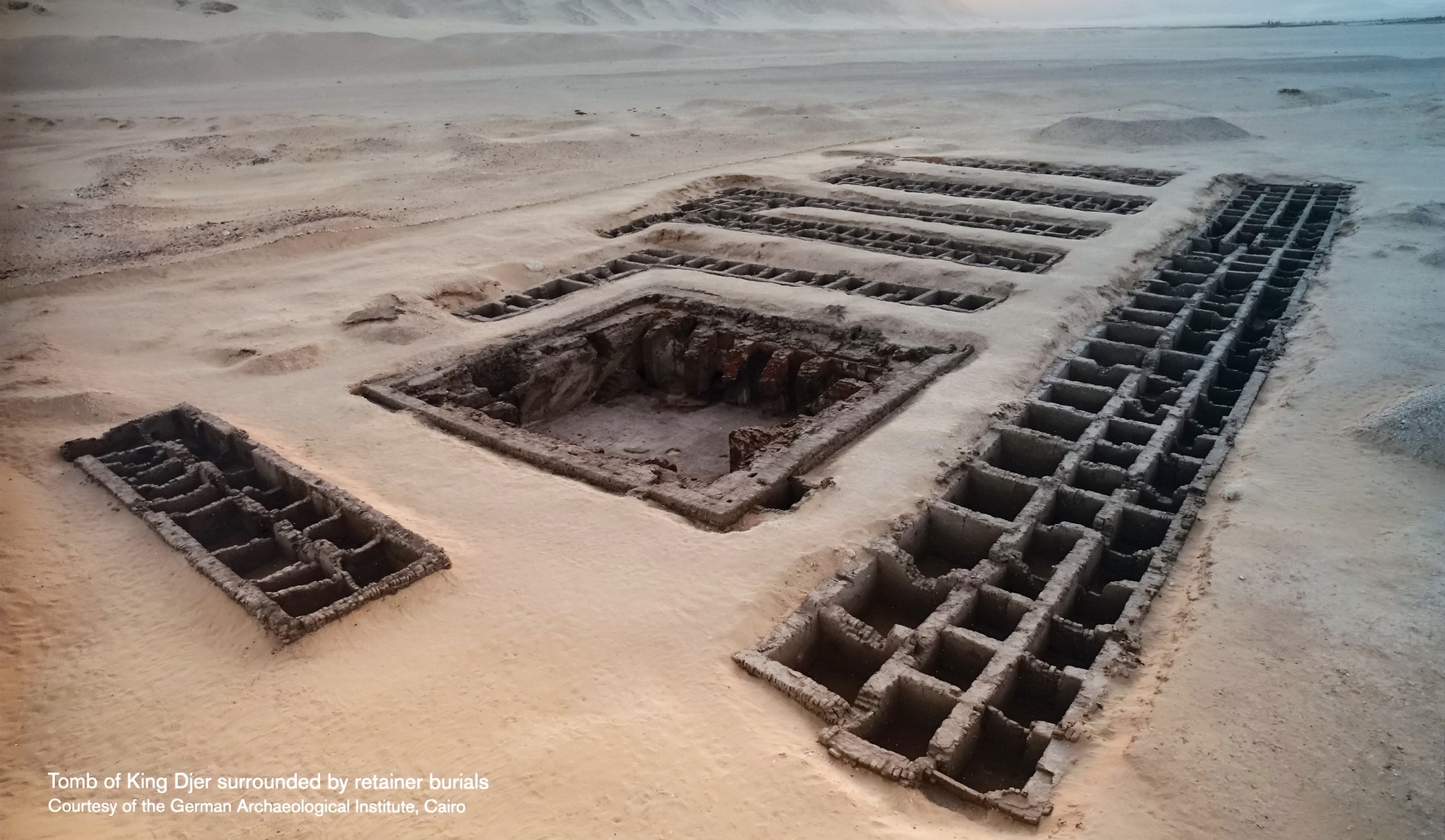 La pratica del sacrificio umano nel predinastico e durante la I dinastia è generalmente riconosciuta e trova riscontri archeologici precisi, che inducono a ritenere, in particolare, che i riti di sepoltura di un sovrano prevedessero l’uccisione di cortigiani e servi che lo avrebbero accompagnato nell’Aldilà, ottenendo quale premio la vita eterna, all’epoca ritenuta prerogativa solo del re e dei suoi familiari; le vittime venivano seppellite nelle piccole tombe sussidiarie scavate accanto alla mastaba reale, riportate alla luce in gran numero anche attorno all’ultima dimora di Merneith.