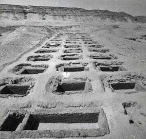 Queste tombe erano fosse nelle quali il corpo del defunto veniva deposto avvolto in teli di lino e con un corredo composto da vassoi con del cibo, da giare di vino e dagli strumenti del loro mestiere; le fosse venivano poi chiuse con assi di legno sulle quali veniva costruita una bassa sovrastruttura rettangolare in pietra.
