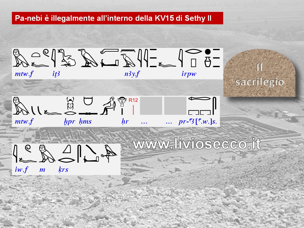 L’elenco è impressionante perché comprende furti nelle tombe di operai defunti, furti e sacrilegi nella tomba KV15 di Sethy II, sottrazione di manodopera pagata dal faraone per edificare la TT211 (tomba privata di Pa-nebi), sottrazione di attrezzatura pubblica e rottura della stessa, giuramenti falsi per scagionarsi da ruberie ritrovate poi effettivamente a casa sua.