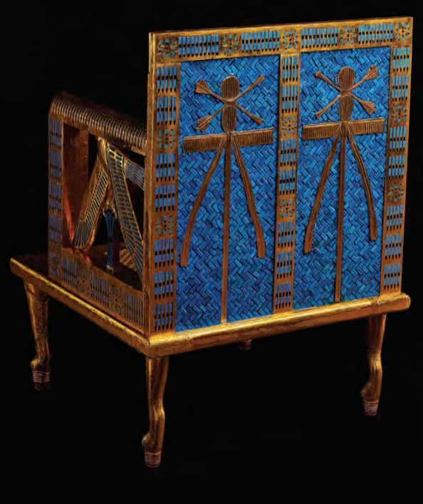 La parte posteriore dello schienale era decorata con quattro emblemi della dea Neith, ognuno dei quali issato sul suo stendardo rivolto verso il centro; sotto di essi c’era un fregio di sedici motivi intarsiati simili alla barba posticcia divina o reale, e l’insieme era incorniciato da rosette e piccole barre.