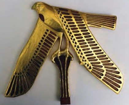 Le due aperture quadrate laterali, sotto i braccioli, erano riempite con un’immagine traforata del dio falcone Horus ad ali spiegate, poggiato su di una colonna palmiforme, finemente intarsiato con inserti di maiolica.