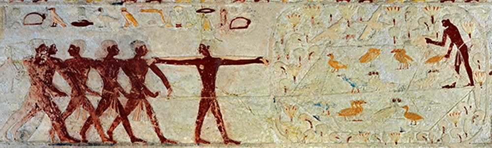 Il secondo mostra la cattura degli uccelli acquatici nella palude, rappresentata come uno specchio d’acqua circondato da ninfee; questa scena è tipica della decorazione delle cappelle funerarie dell’Antico e Medio Regno e ne parleremo in un successivo approfondimento;