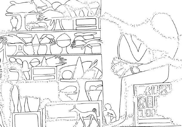 Di fronte a lei, distribuiti su quattro sotto-registri, vi sono tavoli e supporti colmi di offerte: volatili, verdure, dolci, ciotole, giare, nonché una brocca e un catino per lavarsi prima e dopo i pasti; nel sotto registro più basso, accanto al tavolo più grande, si trova un cane con orecchie dritte e coda arricciata.