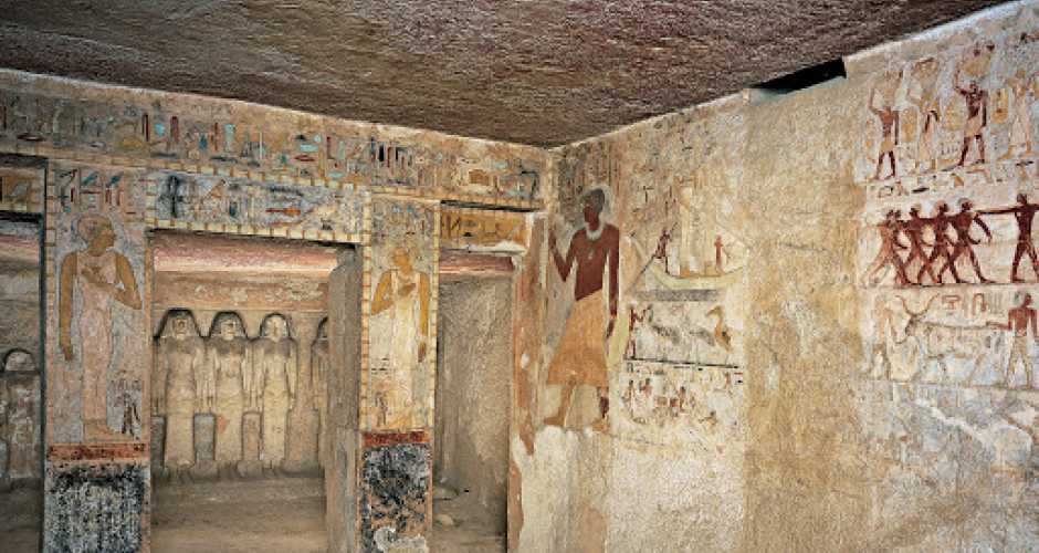 Le scale dell’ingresso conducono direttamente nella sala principale della cappella, splendidamente decorata; ammireremo insieme le scene dipinte sulle pareti, che offrono una vivace immagine della vita di una persona di altissimo lignaggio dell’Antico Regno.