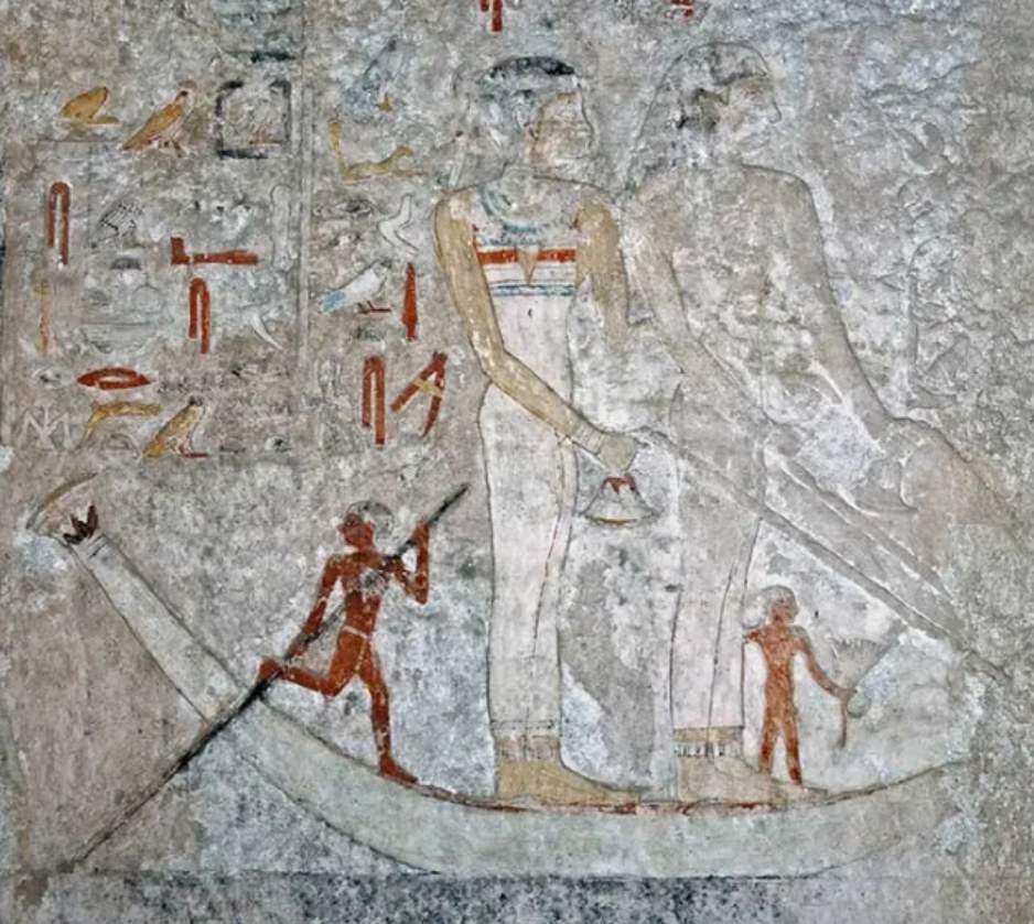 Dietro di lui, nella metà superiore della parete, sono raffigurate Meresankh e sua madre su di una barca che navigano tra i canneti della palude svolgendo l’antico rituale del “far tintinnare i papiri” che serviva ad ottenere la presenza sacra della dea Hathor in forma bovina.