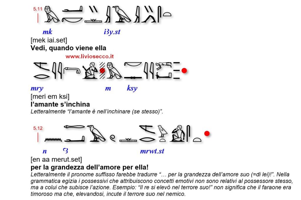 Qualche anno fa, con i miei allievi, traducemmo il Papiro Harris 500 dove sono riportate alcuni brani che possono davvero essere definiti Liriche d’Amore.