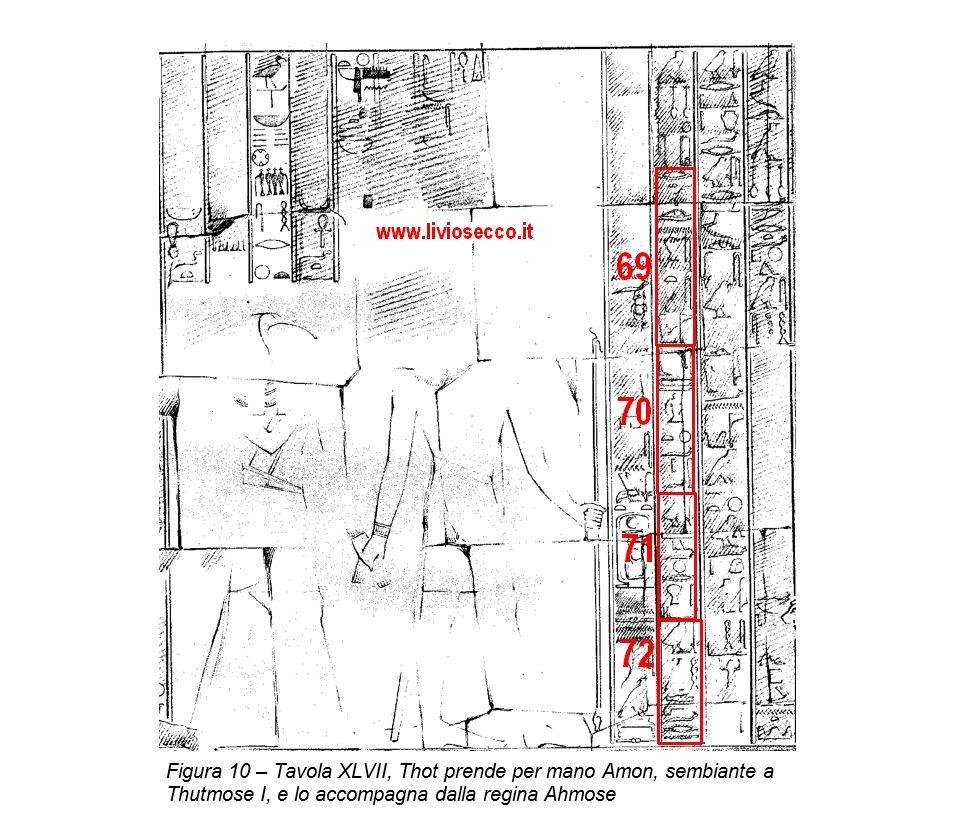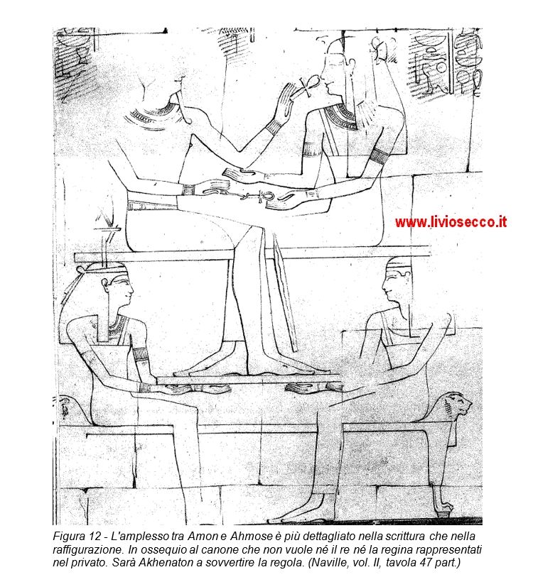 Nel rilievo epigrafico tratto dalla tavola 47 del volume 2 di Naville, si può vedere Thot che, per mano, accompagna di notte Amon nelle stanze private della regina. Poi lo lascia solo con lei che dorme.