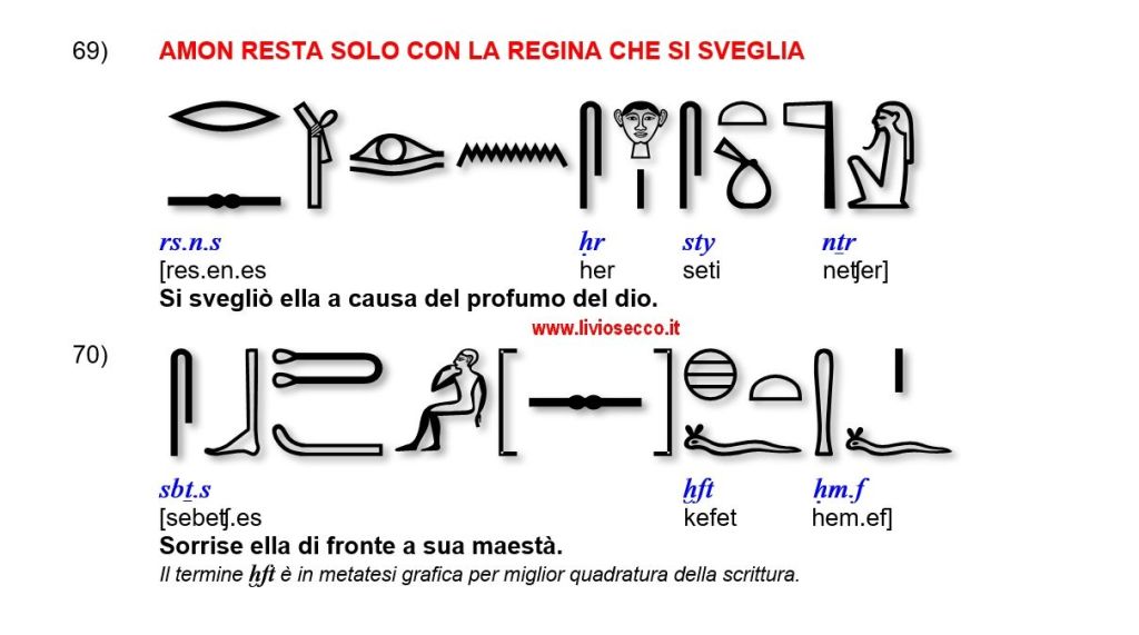 Per non spaventarla Amon prende le sembianze del re e si avvicina ad Ahmose. Ma il profumo del dio è particolare ed è molto intenso. L’aroma si diffonde immediatamente nella stanza buia e la regina si sveglia.